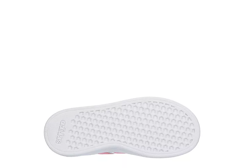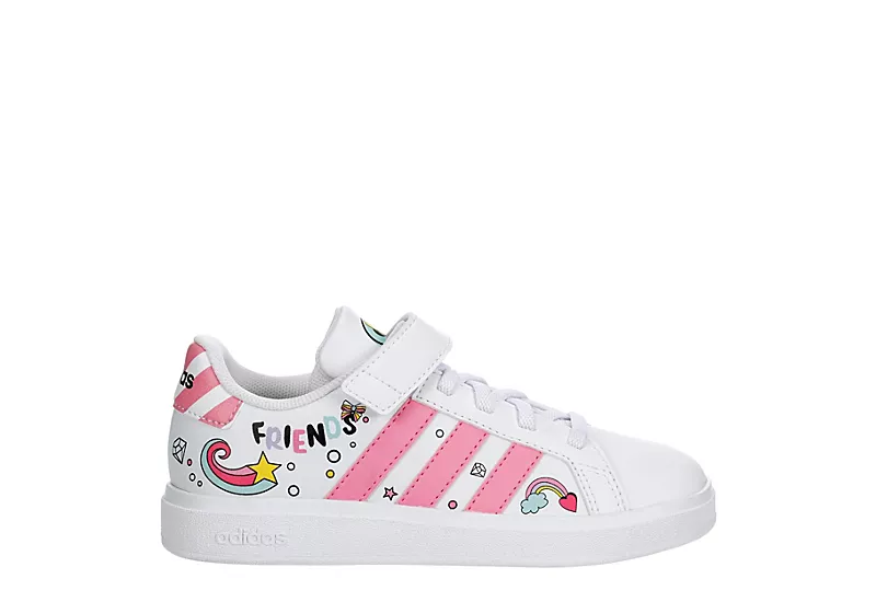 Keep her sneaker game sharp with the Grand Court 2.0 girls’ sneaker from adidas. Featuring a faux leather upper made from recycled materials, this lace-up shoe has bold 3-Stripes logo and fun graphics for extra style. A cushioned insole comforts every step, while the rubber outsole is durable on the court or the sidewalk.